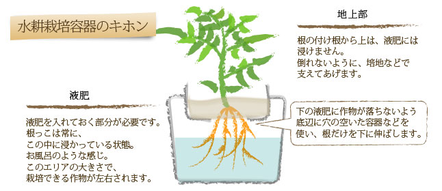 根の半分程度は、酸素を供給できるように空気に触れさせておけるよう、液肥の水面を少し下げて栽培します。電気は必要ないので、一番手軽にできる方法です。空気に触れている根が乾かないように「吸水ひも(フェルト)」等の工夫をするとよりGood。